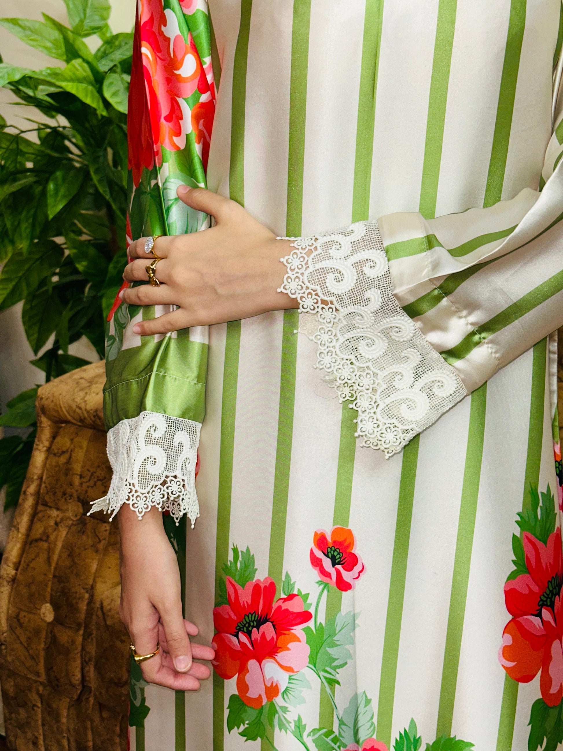 Introducing the Elara Silk Kaftaan, a timeless piece that combines elegance with comfort. Crafted from luxurious silk, this kaftaan features a stunning green and white lining that peeks through delicate lace detailing. The intricate floral print adds a touch of sophistication, making it perfect for both casual gatherings and special occasions. The flowing silhouette flatters all body types while the breathable silk keeps you cool and comfortable throughout the day. An effortless choice for those seeking refined style with a contemporary twist.