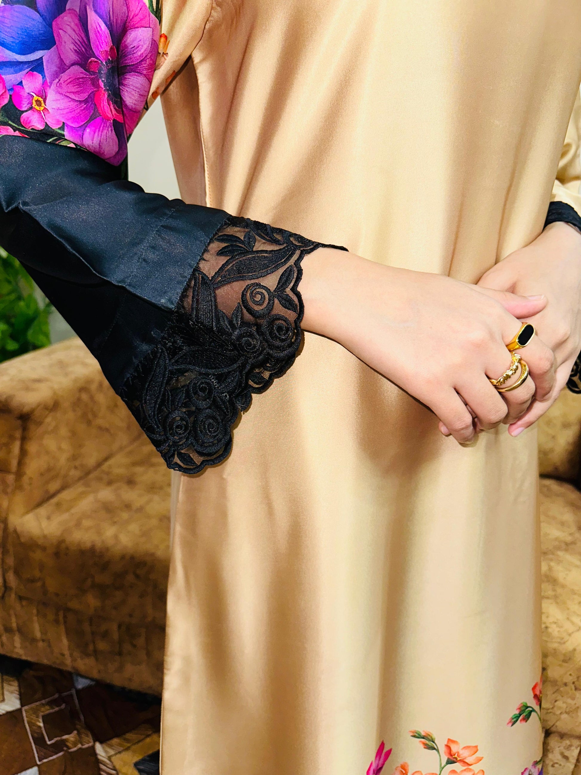 Drape yourself in luxury with the Nyra Silk Kaftaan, crafted from premium silk for a soft, breathable feel against your skin. This relaxed, elegant silhouette flatters all body types while maintaining a sophisticated aesthetic. Delicate floral and lace detailing adds refined charm, making it perfect for intimate gatherings, leisurely afternoons, or quiet moments at home. The flowing design ensures comfort without compromising on style, creating an effortlessly graceful look that transitions seamlessly from day to evening wear.